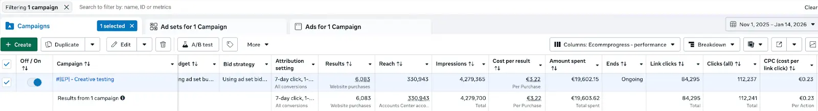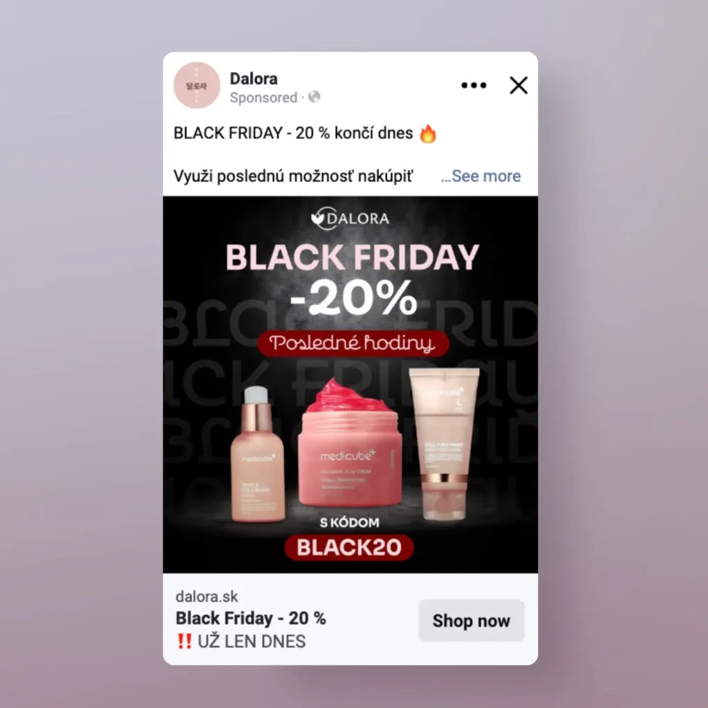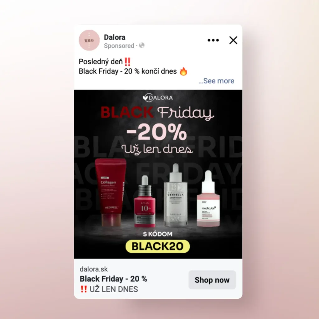 Počas bežného roka nechávame v kampaniach zapnuté všetky placementy, no pri veľkých akciách, ako je Black Friday, vytvárame samostatné formáty optimalizované na Stories. Tento prístup aplikujeme pri väčšine klientov a aj v tomto prípade sa ukázal ako veľmi efektívny. Práve tento adset dosahoval najlepší výkon.